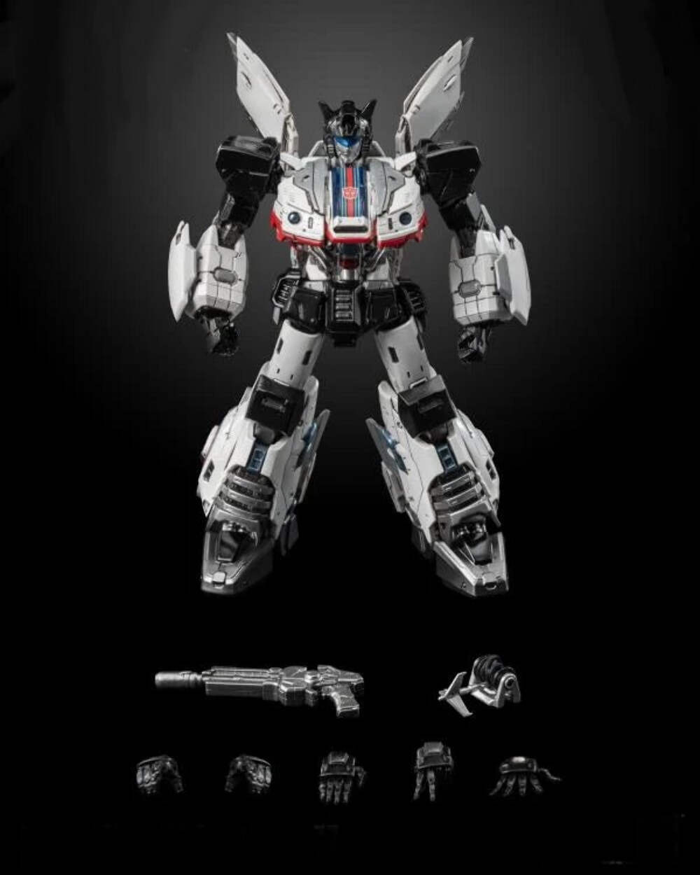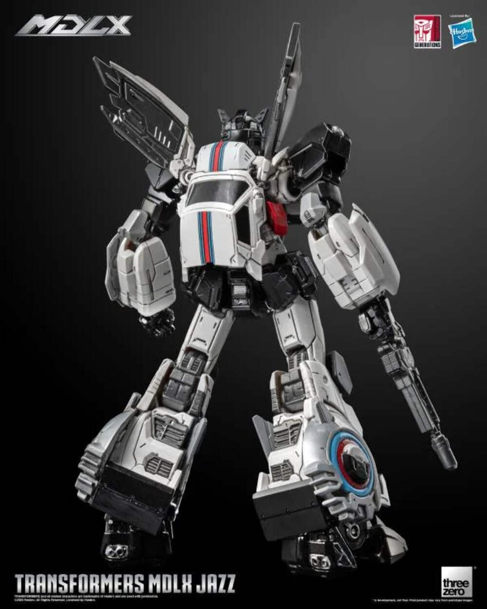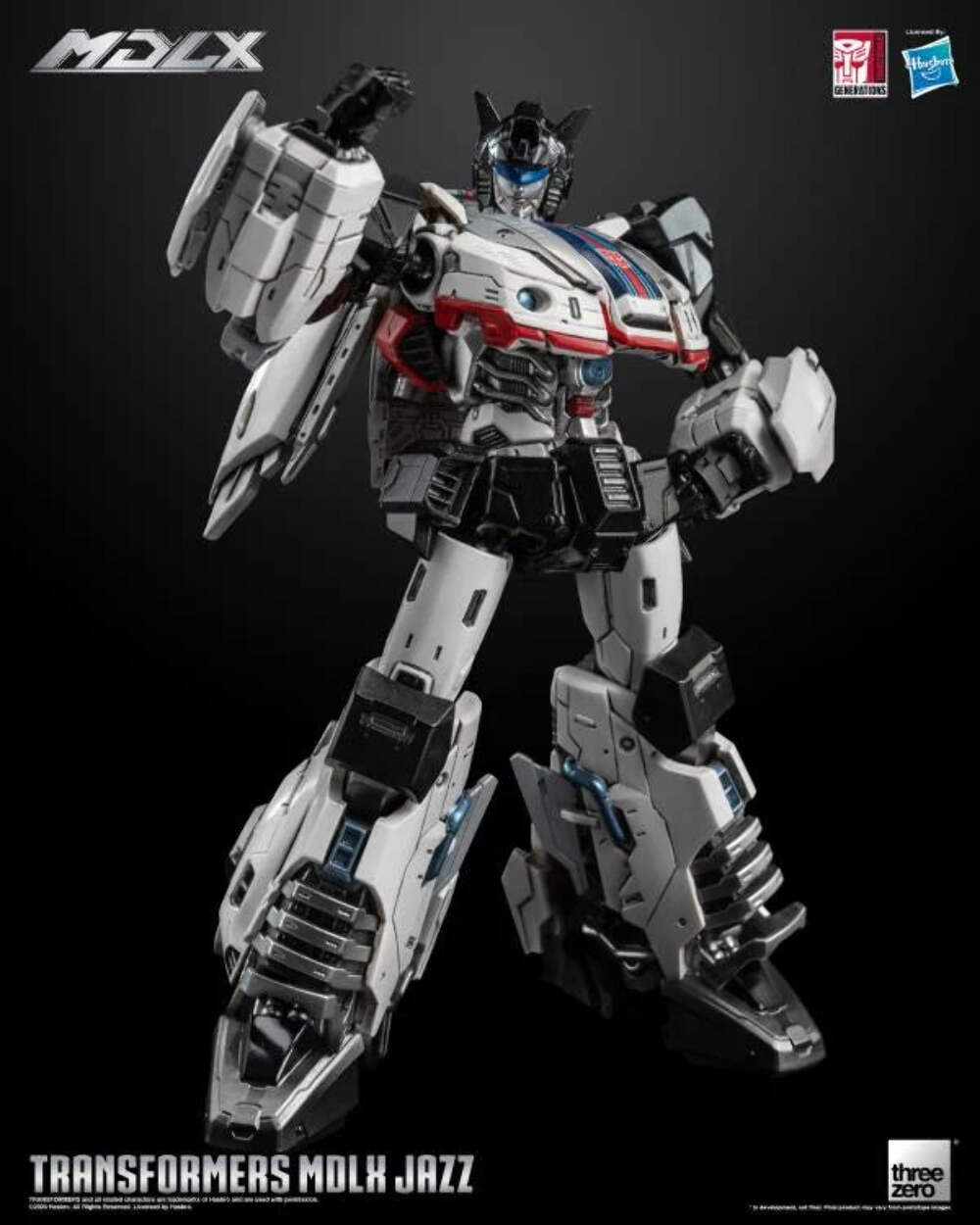 Transformers MDLX Jazz mide aproximadamente 15 cm de alto, con aproximadamente 46 puntos de articulación y una estructura de DieCast Metal. Los accesorios incluyen cinco pares de manos intercambiables, un rifle de fotones y un gancho de agarre. Este último viene equipado con un cable retráctil completamente funcional que permite extenderlo y rebobinarlo, mejorando la experiencia interactiva.