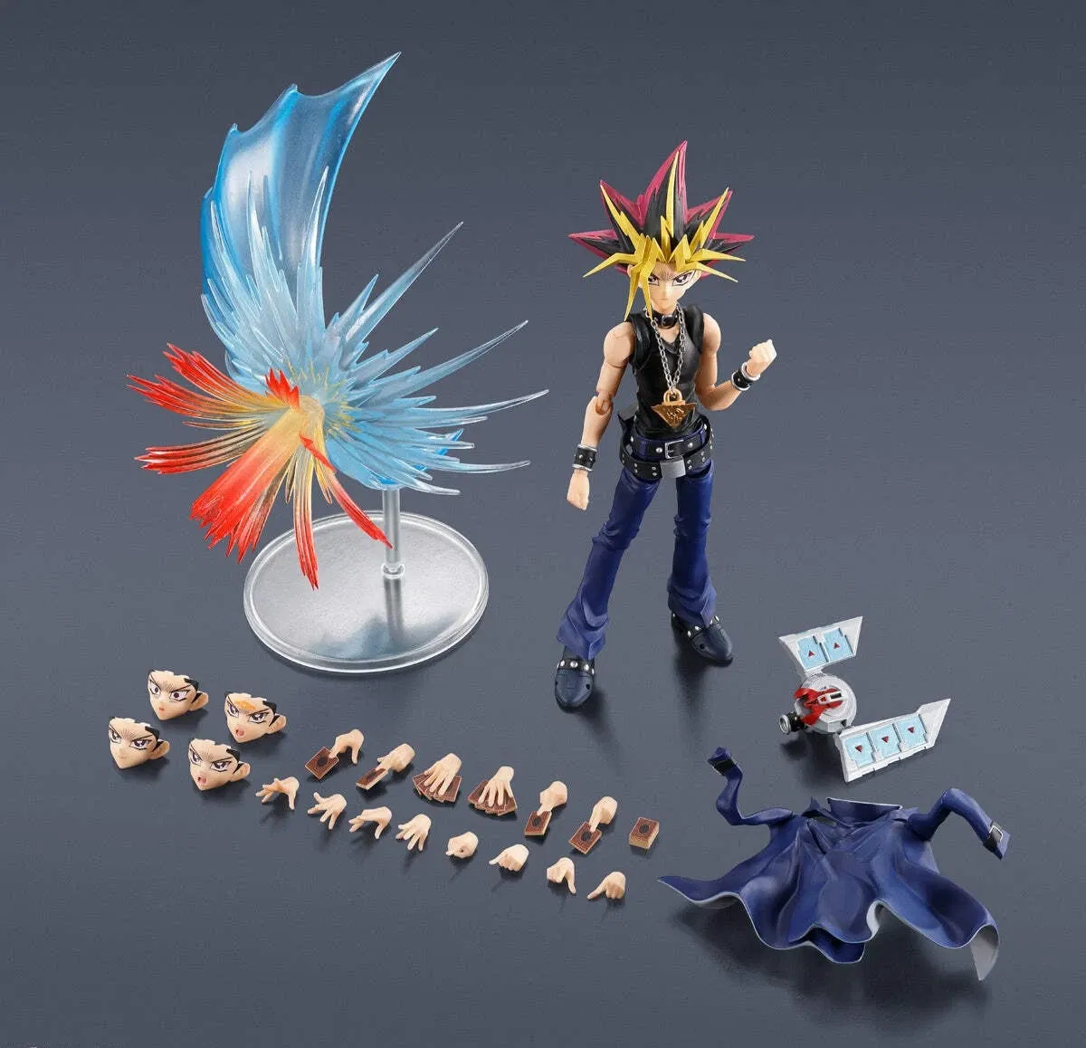 Recrea duelos feroces con esta serie S.H.Figuarts. Por fin, la serie "Yu-Gi-Oh! Duel Monsters" se une a S.H.Figuarts, con YAMI YUGI como la primera figura. Además de las impresionantes piezas opcionales, incluye una poderosa pieza con efecto Mirror Force. También incluye otros elementos típicos como el Disco de Duelo y el uniforme escolar ondeante, lo que te permite recrear diversas escenas de la serie.