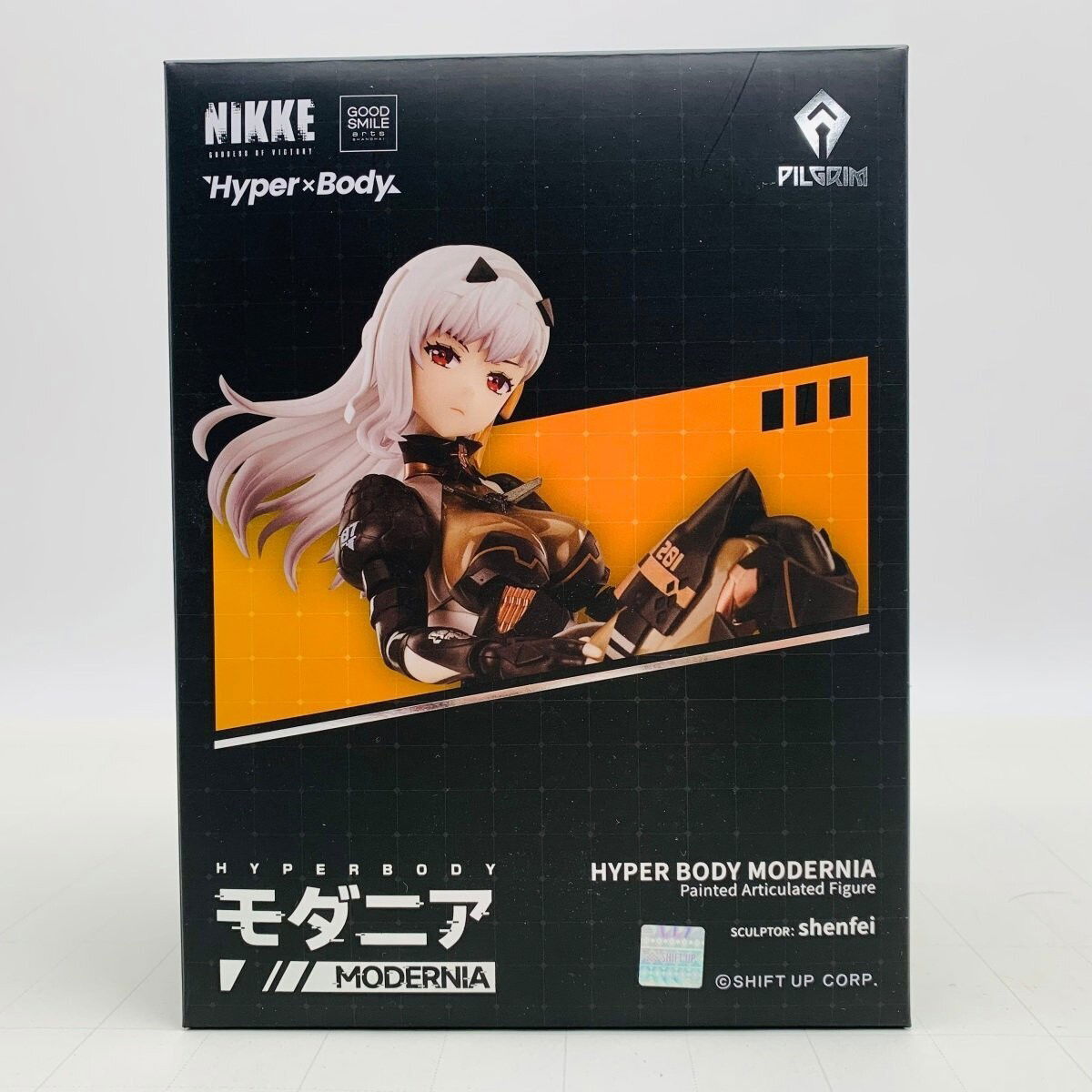 Del popular juego para smartphones "GODDESS OF VICTORY: NIKKE", llega la figura Hyper Body de Modernia. Sus caras incluyen una sonriente, una alegre, una seria y una triste. La figura también incluye sus brazos traseros, gafas de combate y una falda intercambiable para poses de ataque.