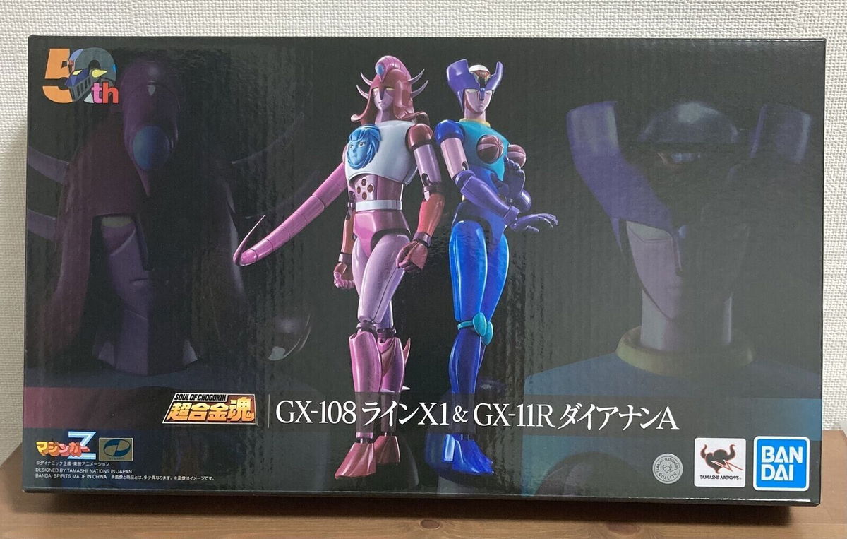 De "Mazinger Z", RHINE X1 y GX-11R DIANAN A se unen a la serie SOUL OF CHOGOKIN. Esto representa la primera interpretación de Chogokin de Rhine X1, como se ve en el episodio 61 de la serie de anime original. Presenta opciones para mostrar con o sin la imagen de Lorelei en su pecho. Los látigos para la cabeza están articulados para mayor posibilidad. Empaquetado junto con Dianan A, el robot compañero de Mazinger Z, en un lujoso conjunto de dos robots.